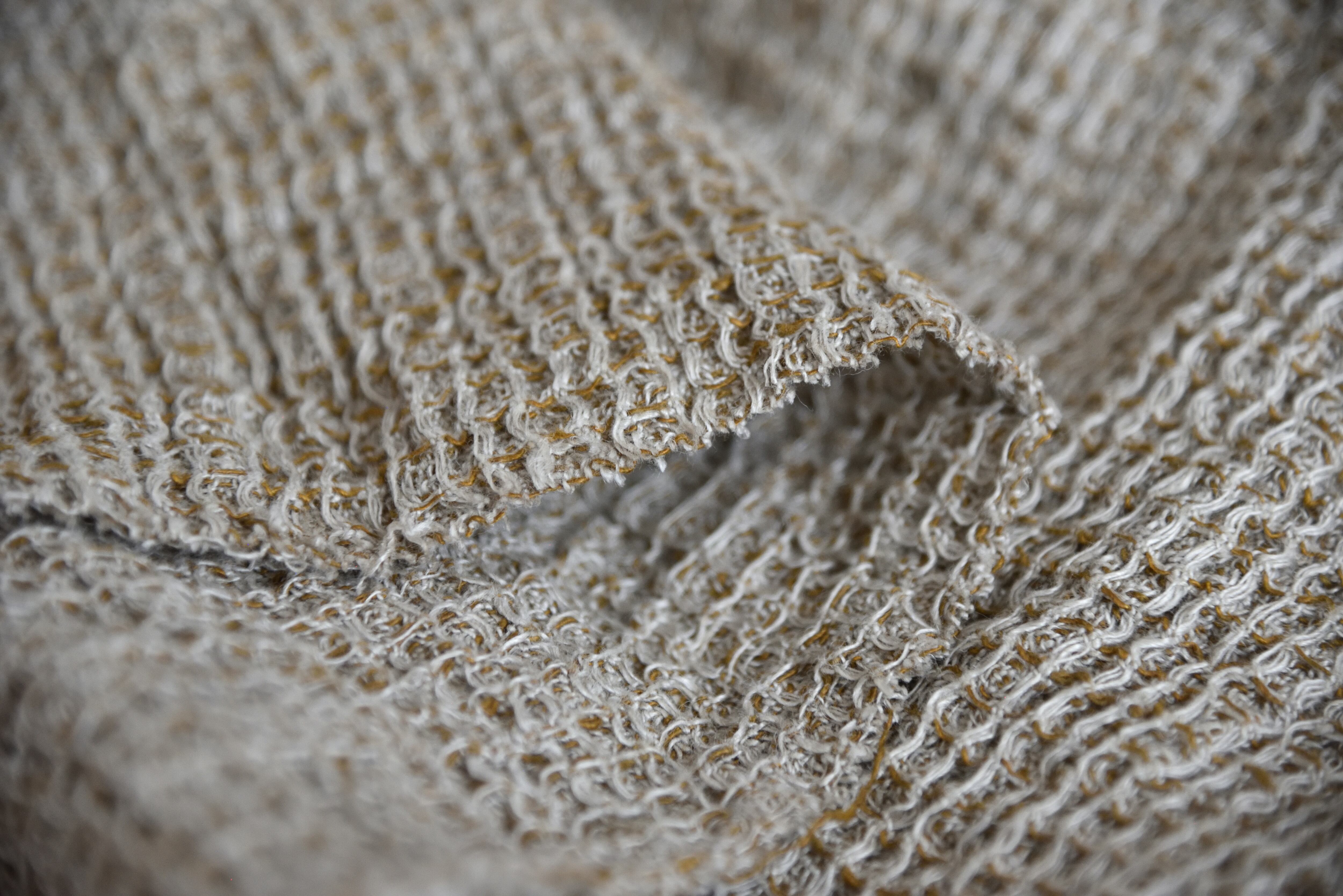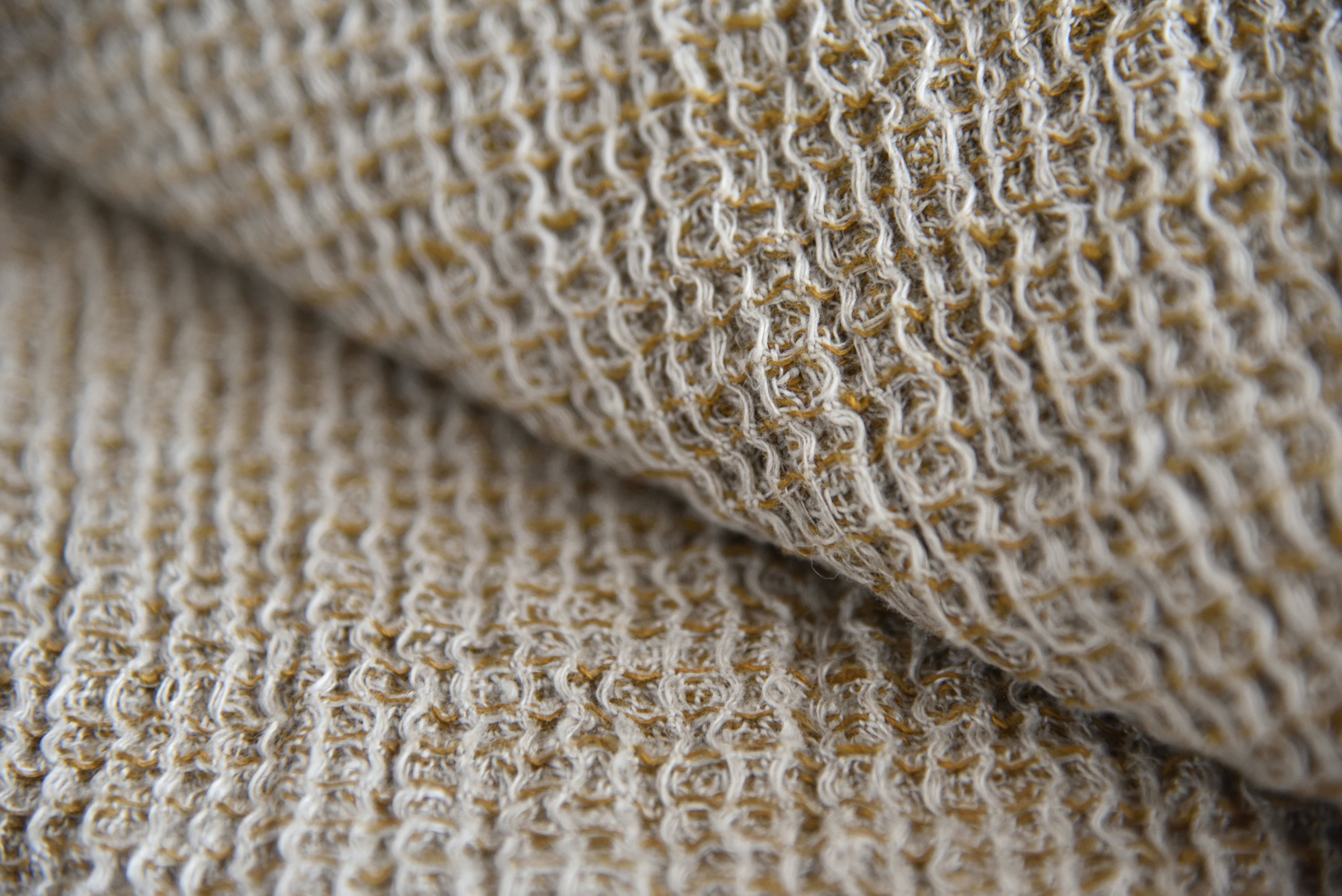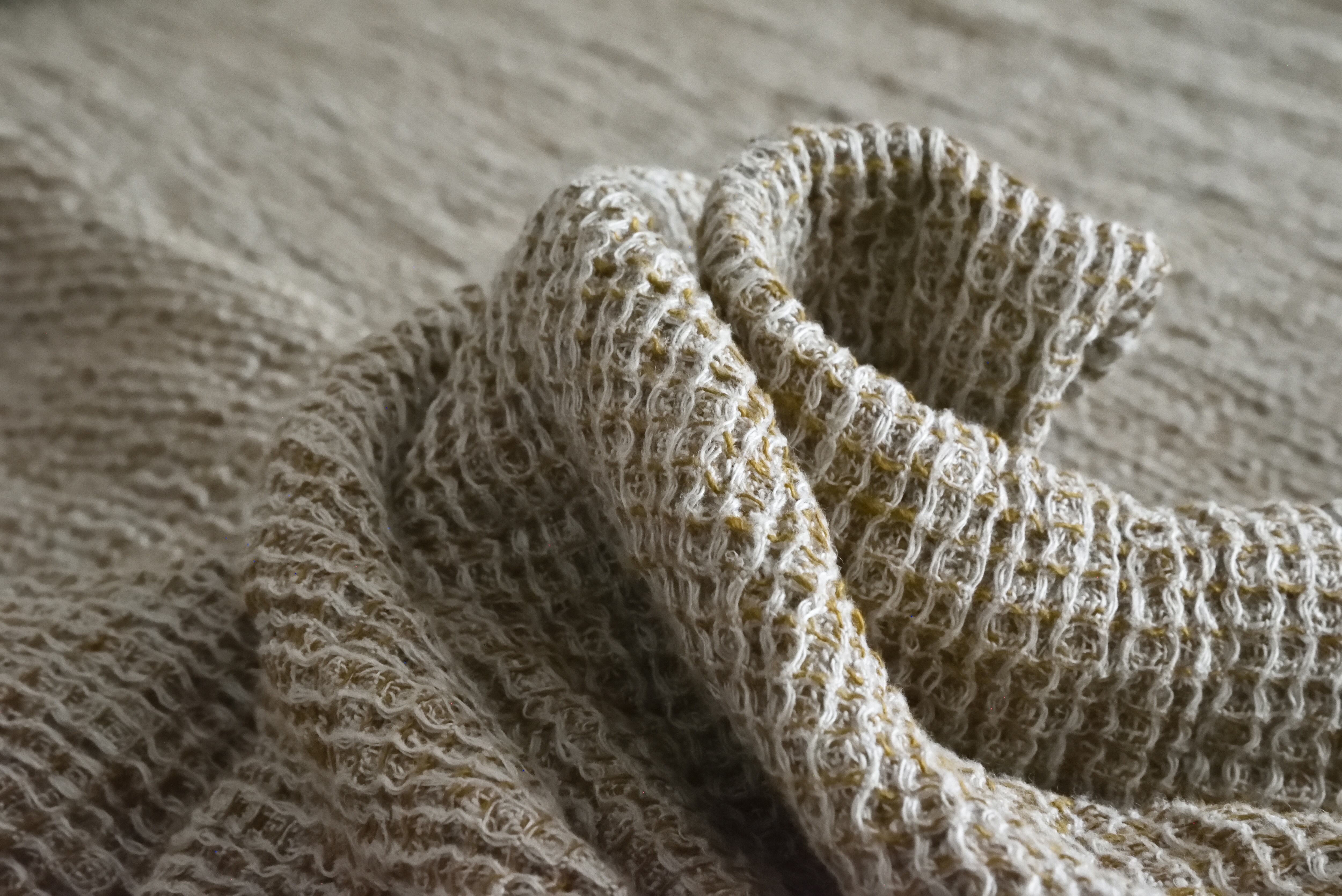 ワッフル組織は生地巾180cmが150cm巾にまで縮みが生まれ、縮みがある分、生地がふっくらしています。